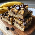 Soft, chewy Banana Oatmeal Bars made with ripe bananas, rolled oats, nut butter, and chocolate chips. This healthy, one-bowl recipe requires no mixer and is naturally sweetened with bananas and maple syrup. Perfect for breakfast on-the-go, after-school snacks, or meal prep!