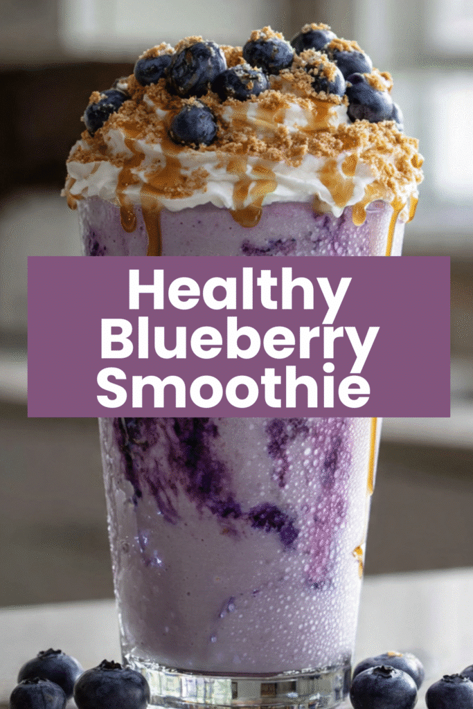 homemade Blueberry Cheesecake Smoothie A tall clear glass is filled with a pale purple smoothie with a rich, velvety consistency. Swirls of deeper blueberry purple are visible throughout, creating a marbled effect. A thick layer of creamy whipped topping sits on top, lightly dusted with crushed graham crackers to mimic cheesecake crust. Fresh blueberries are piled on top, some slightly glossy and bursting. A drizzle of honey or blueberry syrup runs slightly down the inside of the glass for added texture and sweetness. Condensation droplets form on the outside of the glass, giving a chilled, freshly blended feel. Soft natural window light from the side highlights the creamy texture and vibrant blueberry tones. Shot from a slightly overhead angle. Background softly blurred kitchen setting with subtle countertop details. The top portion of the image intentionally left with clean negative space for Pinterest text overlay. Blueberry Cheesecake Smoothie