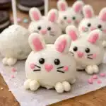 Now comes the absolutely adorable part—making your bunnies come to life! While the white chocolate coating is still wet and tacky, press two mini chocolate chips or edible eyes into each ball for the eyes. Add a tiny dot of pink candy melt, a pink sprinkle, or pink sanding sugar on each side for rosy cheeks.