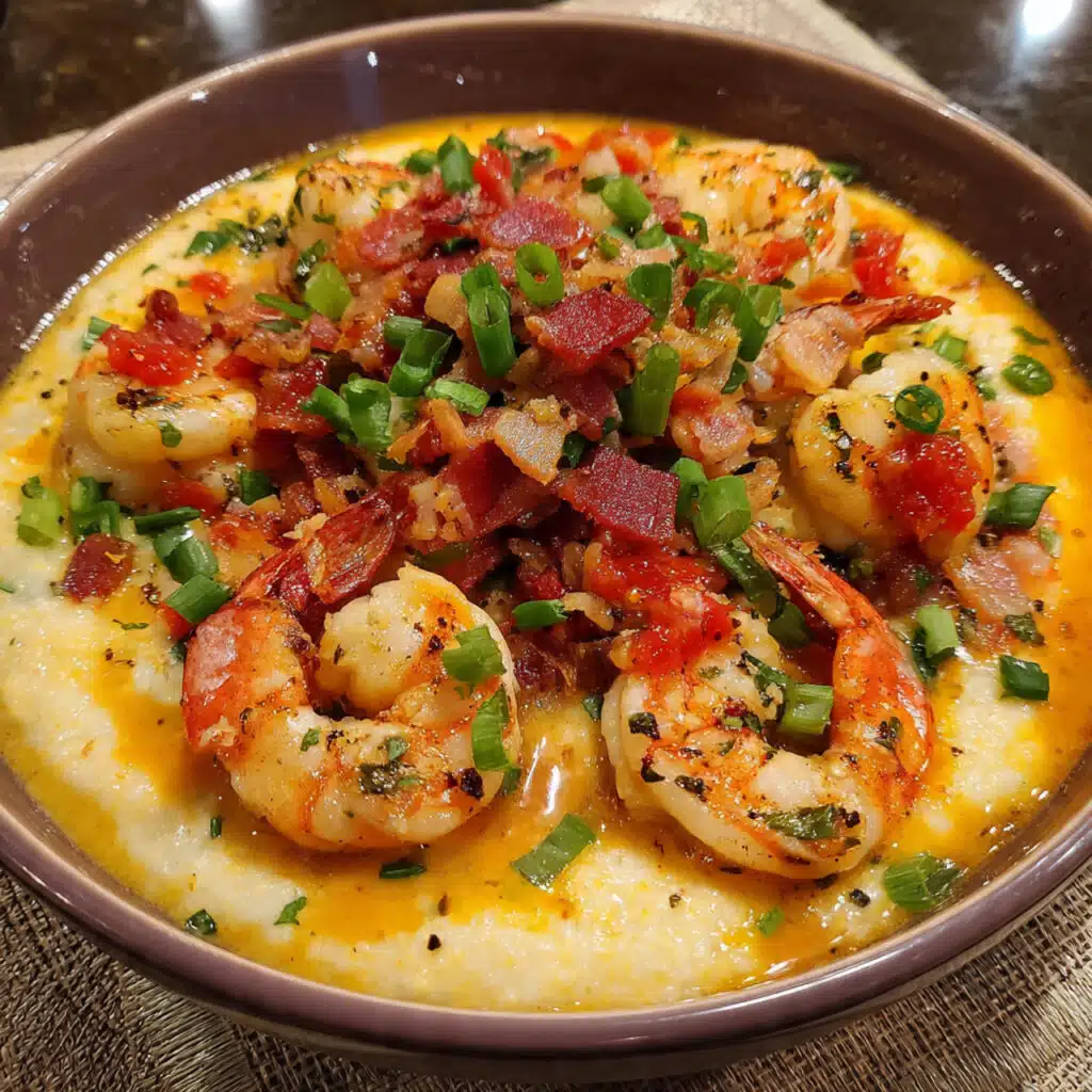 Ultimate Creamy Cajun Shrimp and Grits features succulent shrimp seasoned with bold Cajun spices, served over ultra-creamy three-cheese grits and topped with crispy bacon. This restaurant-quality Southern comfort food recipe is ready in just 30 minutes and delivers incredible flavor with simple ingredients. The rich pan sauce with Calabrian peppers, garlic, and lemon ties everything together beautifully.