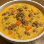 Cheeseburger soup is a rich and hearty dish made with ground beef, tender potatoes, and vegetables simmered in a creamy, cheesy broth. It’s flavorful, filling, and the perfect way to turn simple ingredients into comfort food. A cozy meal that’s easy enough for weeknights but satisfying enough for the whole family.