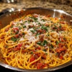 Cheesy One Pot Spaghetti is my go-to when life gets hectic and I need something comforting, delicious, and ridiculously easy on the table FAST. This recipe combines tender spaghetti, rich tomato sauce, aromatic garlic, and melty mozzarella cheese—all cooked together in ONE POT.