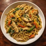 Cornstarch in the sauce creates that glossy, restaurant-style coating that clings to every noodle and vegetable without being gummy. Oyster sauce is the secret weapon here – it adds deep umami and a subtle sweetness that makes this taste authentically Chinese. Chinese cooking wine brings complexity and helps tenderize the chicken while adding that distinctive restaurant flavor you can’t quite put your finger on.