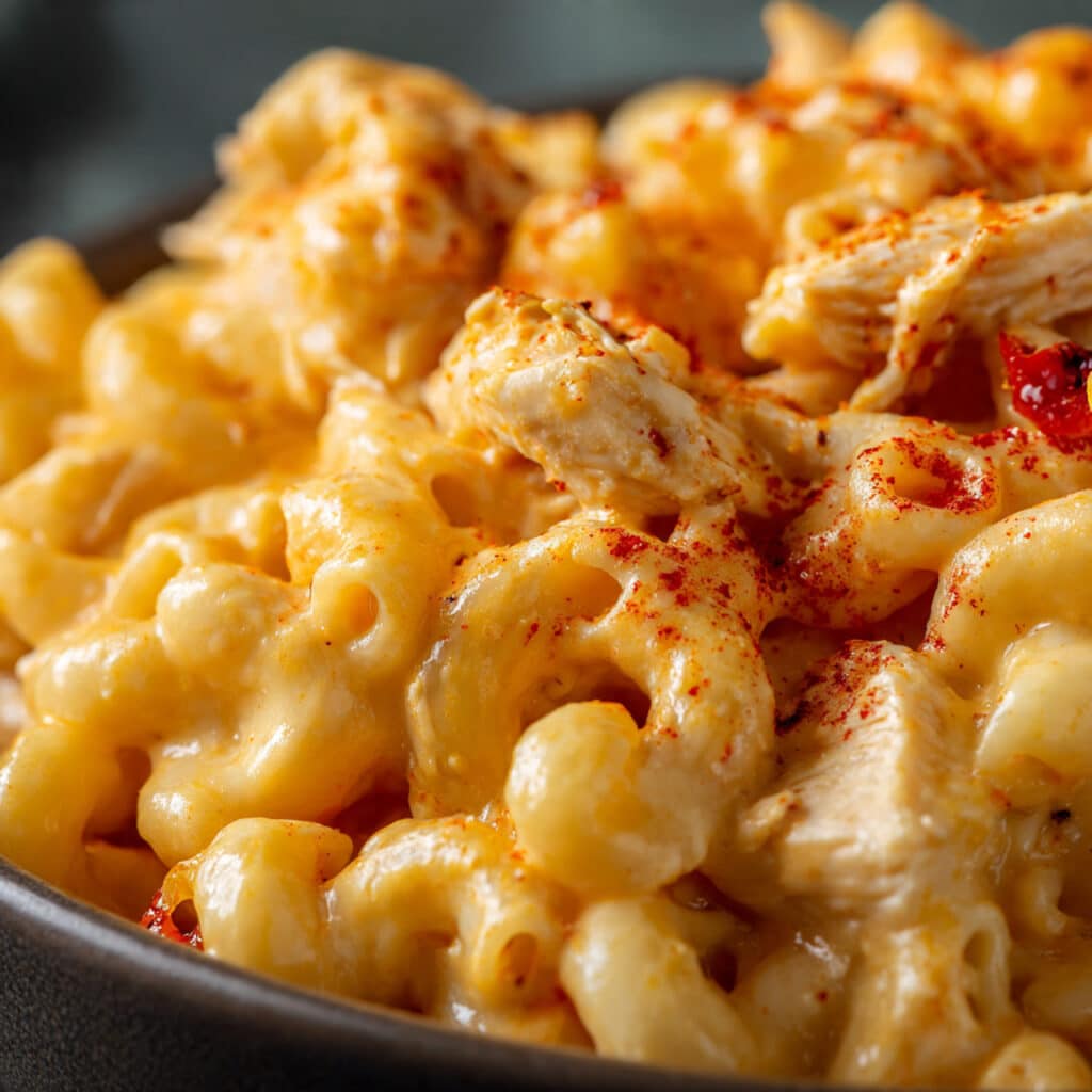 Serve your chicken mac and cheese hot, garnished with an extra sprinkle of paprika, fresh cracked pepper, or a handful of extra shredded cheese if you’re feeling indulgent.