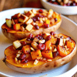 Cranberry Apple Twice Baked Sweet Potatoes are the ultimate cozy fall side dish that combines creamy sweet potatoes with tart cranberries, crisp apples, and warm spices. These beauties are baked twice for maximum flavor and texture, then topped with a buttery pecan crumble that’ll have everyone asking for seconds.