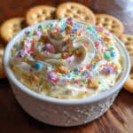 Spread the dip evenly into a shallow serving bowl or pie dish. Now comes the fun part—generously sprinkle those pastel or rainbow sprinkles all over the top! Don’t be shy; this is where the magic happens.
