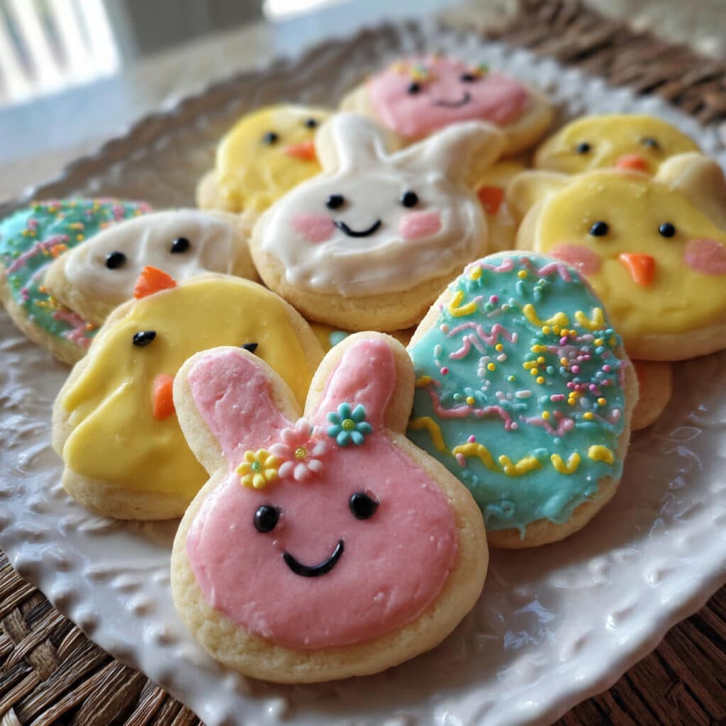Easter Sugar Cookies that yields tender, buttery cookies perfect for decorating with royal icing. Features bunny, egg, and chick shapes with pastel colors and springtime sprinkles. Optional lemon zest adds brightness. Great for Easter brunch, kid-friendly baking, or springtime celebrations.