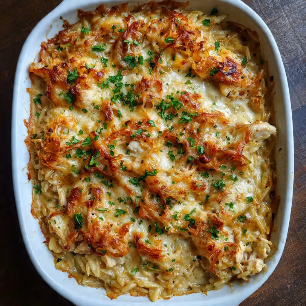 French Onion Chicken Orzo Casserole is a comforting one-pot meal featuring deeply caramelized onions, creamy orzo pasta, shredded chicken, and loads of melted cheese. Easy to make and perfect for cozy weeknight dinners!