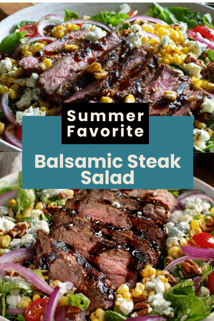 This Grilled Balsamic Steak Salad layers juicy balsamic-marinated flank steak, smoky-sweet grilled corn, tangy Gorgonzola crumbles, and toasted nuts over crisp mixed greens, all finished with a bold balsamic honey dressing. It eats like a full steakhouse meal and comes together in about 30 minutes of active time.