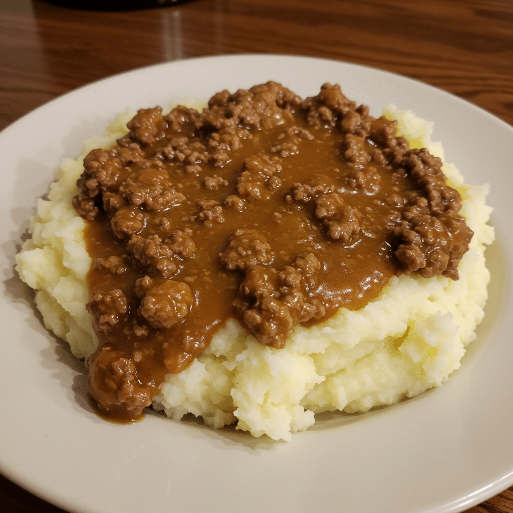 A classic comfort food recipe featuring seasoned ground beef in a rich, creamy gravy served over fluffy mashed potatoes. Perfect for family dinners and cozy nights in.