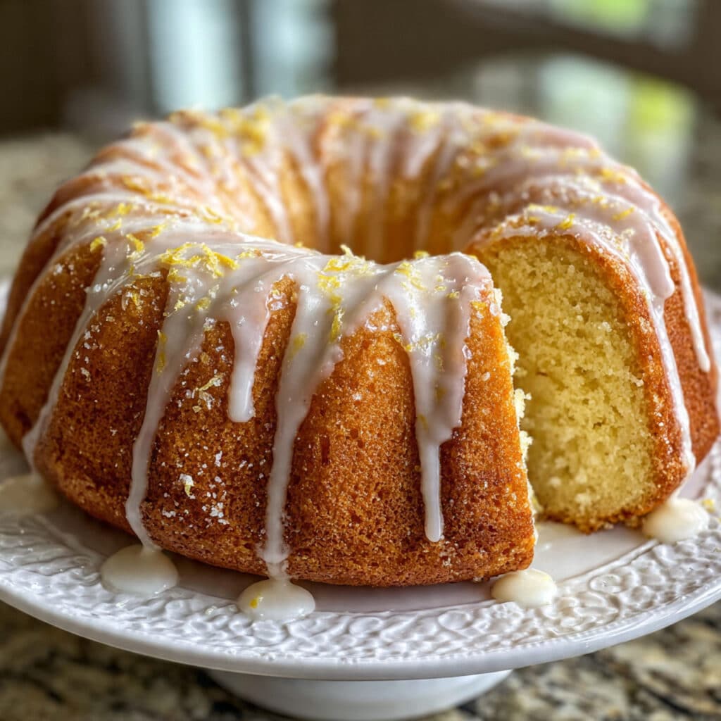 golden Italian lemon pound cake with glossy white lemon glaze dripping down the sides, garnished with fresh lemon zest
