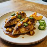 Jalapeno peach chicken is a sweet and spicy skillet dinner that brings together tender chicken thighs, fresh peaches, and sliced jalapenos in a sticky peach glaze. The combination might sound unusual at first, but that contrast between sweet fruit and spicy peppers creates something truly special. This easy one-pan meal comes together in under 30 minutes for a weeknight dinner that tastes like you spent hours in the kitchen.