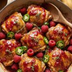 Tender chicken thighs glazed with tangy raspberry preserves and jalapeño peppers, topped with fresh berries for a sweet and spicy dinner the whole family will love.