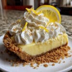 When you’re ready to serve, whip the heavy cream with powdered sugar and vanilla until soft peaks form. Spread or pipe it over the chilled pie, then garnish with lemon zest or thin lemon slices for that gorgeous finishing touch.