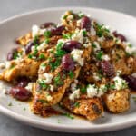 Transfer your cooked chicken to a clean plate and let it rest for 2 to 3 minutes. This lets the juices redistribute so every bite is moist and tender. Garnish with fresh chopped parsley, crumbled feta, and sliced Kalamata olives if you’re using them.