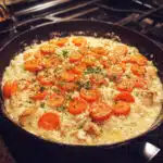 A hearty one-pot chicken and rice dish cooked with tender chicken pieces, fluffy seasoned rice, and colorful vegetables in a savory, creamy sauce.