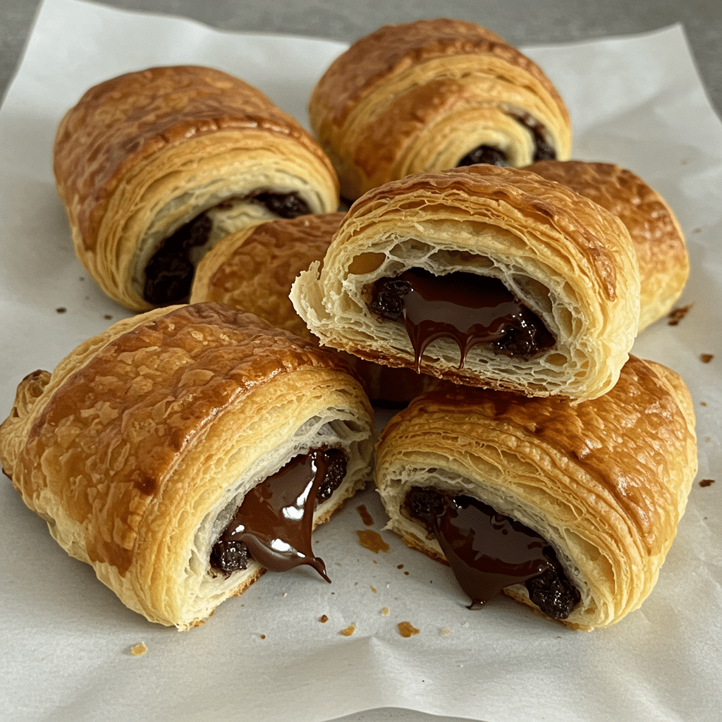 Easy homemade chocolate croissants made with store-bought puff pastry, dark chocolate chips, and a golden egg wash. Perfect for breakfast, brunch, or dessert.