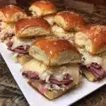 Reuben Sliders are tender Hawaiian rolls stuffed with pastrami, Swiss cheese, tangy sauerkraut, and Thousand Island dressing, all topped with an incredible garlic butter. They bake up golden, gooey, and absolutely irresistible!