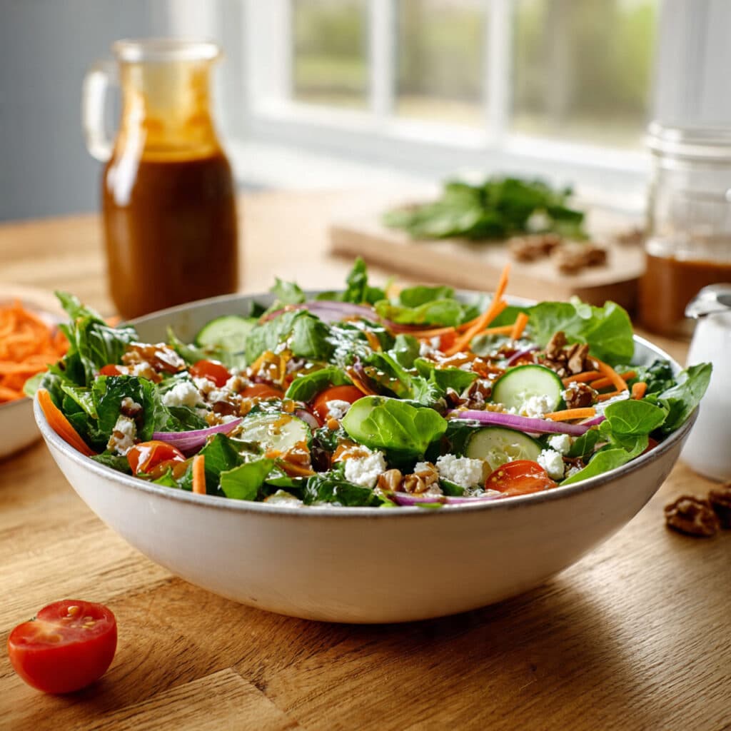 Drizzle the balsamic honey dressing over the salad — start with about two-thirds of it, toss gently with your tongs, and then taste before adding more. You want every leaf lightly coated, not swimming in dressing. Serve immediately — this salad is at its very best the moment it’s dressed, while the greens are still crisp and the goat cheese is still cool.