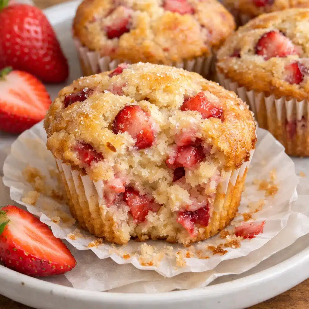 Freshly baked strawberry muffins with golden brown tops sprinkled with coarse sugar, arranged on a white plate with fresh strawberries