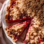 Sweet and tangy strawberry rhubarb pie topped with a buttery crumb topping. Easier than double-crust pie and absolutely delicious!