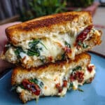 Elevate your grilled cheese game with this gourmet Sun Dried Tomato Spinach and Ricotta Grilled Cheese! Creamy ricotta mixed with sweet sun-dried tomatoes, fresh spinach, and garlic, all melted together with gooey mozzarella between buttery, golden-brown bread. It’s the grown-up grilled cheese you didn’t know you needed—quick, easy, and absolutely delicious!