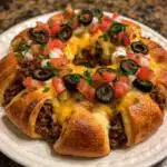 A stunning taco crescent ring made with seasoned ground beef, melted cheese, fresh tomatoes, and olives wrapped in golden crescent dough. This easy dinner recipe looks impressive but comes together in just 30 minutes. Perfect for busy weeknights, game day parties, or whenever you need a crowd-pleasing meal that’s as beautiful as it is delicious.