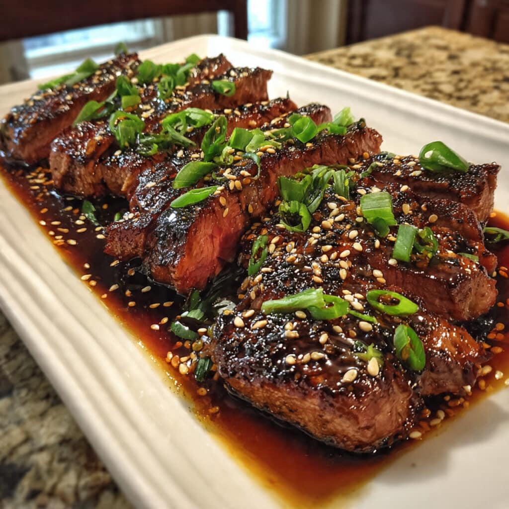 Tender strips of beef marinated in a homemade teriyaki sauce with soy sauce, brown sugar, sesame oil, garlic, and ginger, then pan-seared to caramelized perfection and topped with toasted sesame seeds and fresh green onions.